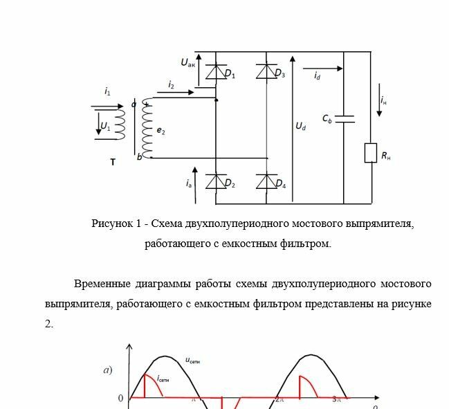 Схема двухполупериодного мостового выпрямителя, работающего с емкостным фильтром представлена на рисунке 1.