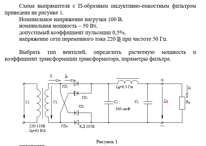 - Рассчитать параметры сглаживающего фильтра, который обеспечит допустимый коэффициент пульсации напряжения на нагрузке.