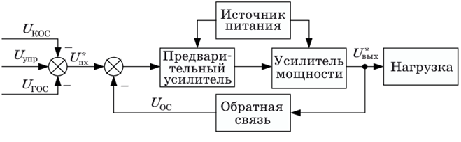 Проектируемый усилитель малой мощности предназначен для работы в составе системы автоматического управления. Его функции заключаются в выполнении операции суммирования сигнала входного датчика, сигналов главной (ГОС) и корректирующей (КОС) обратных связей системы управления и усилении сигнала рассогласования по величине и мощности. Усилитель (Рисунок 1) дол жен включать в свой состав следующие элементы: сумматор, осуществляющий суммирование и определяющий сигнал рассогласования, который представляет собой входное напряжение усилителя ; сумматор, осуществляющий сравнение входного напряжения усилителя с сигналом отрицательной об ратной связи (ООС), охватывающей усилитель ; предваритель ный усилитель, обеспечивающий усиление сигнала рассогласова ния и защиту усилителя от перенапряжений. Усилитель мощности (УМ) обеспечивает передачу необходимой мощности в нагрузку и защиту усилителя от перегрузок по току. Цепь ООС, охватывающая усилитель в целом, обеспечивает заданную точность и стабильность его характеристик.