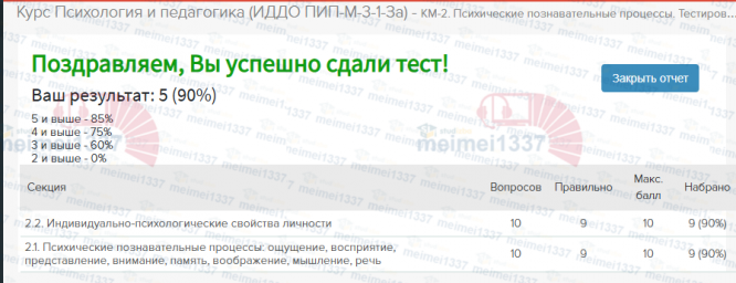 Курс Психология и педагогика - КМ-2. Психические познавательные процессы. Тестирование - 90%