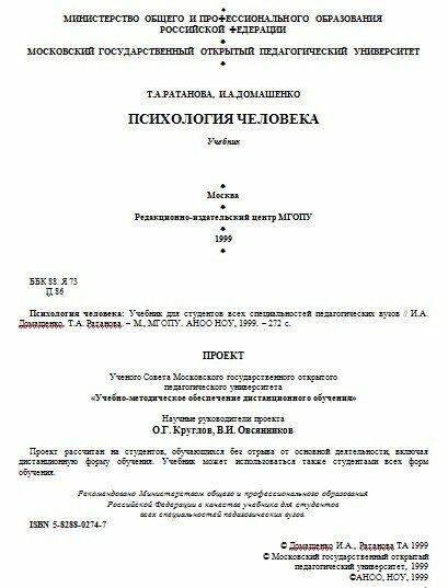 Для студентов МГГУ по предмету ПсихологияУчебник Т.А. РАТАНОВА, И.А. ДОМАШЕНКО ПСИХОЛОГИЯ ЧЕЛОВЕКАУчебник Т.А. РАТАНОВА, И.А. ДОМАШЕНКО ПСИХОЛОГИЯ ЧЕЛОВЕКА