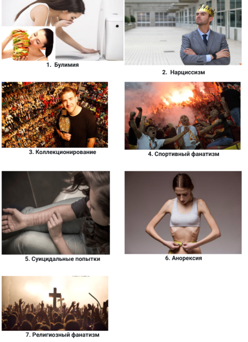 Внимание, в перечне имеются неправильные ответы! Вопрос 3 Выберите правильные ответы из выпадающего списка в таблице группового и индивидуального видов девиантного поведения, иллюстрации которых представлены ниже: Индивидуальный вид девиантного поведенияГрупповой вид девиантного поведения Вопрос 4 Заполните таблицу «Типы девиантного поведения». Внимание, в перечне имеются неправильные ответы! Типы девиантного поведенияОпределение Отклоняющееся поведение, в крайних своих проявлениях представляющее уголовно наказуемое деяние. Один из типов девиантного поведения с формированием стремления к уходу от реальности путем искусственного изменения своего психического состояния посредством приема некоторых веществ или постоянной фиксации внимания на определенных видах деятельности с целью развития и поддержания интенсивных эмоций.
