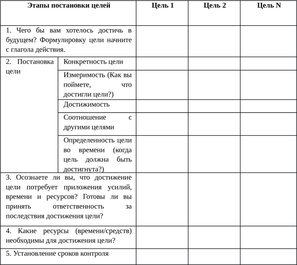 На листе формата А3 составьте декларацию личных целей (7—9 целей) на ближайшие полгода (год), руководствуясь таблицей 1.