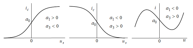 Вопросы аппроксимации нелинейных элементов и гармонического анализа при простом воздействии подробно изложены в [1 – 3].Определение коэффициентов аппроксимации для степенных функций целесообразно проводить методом выбранных точек. При этом неполный полином третьей степени (табл.8.1) описывает ВАХ с началом координат в центре симметрии (рис.8.15). Определение коэффициентов для экспоненциальных функций следует проводить методом приведения к линейному виду. Для кусочно-ломаной прямой параметры аппроксимации определяются графическим путем. Расчет гармоник тока следует провести соответственно с использованием тригонометрических формул кратных аргументов (для степенной аппроксимации), функций Бесселя (при аппроксимации синусом), модифицированных функций Бесселя (для экспоненциальной аппроксимации) и функций Берга (для кусочно-линейной аппроксимации). Значения функций Берга, обычных и модифицированных функций Бесселя приведены в прил. П.3, П.4.