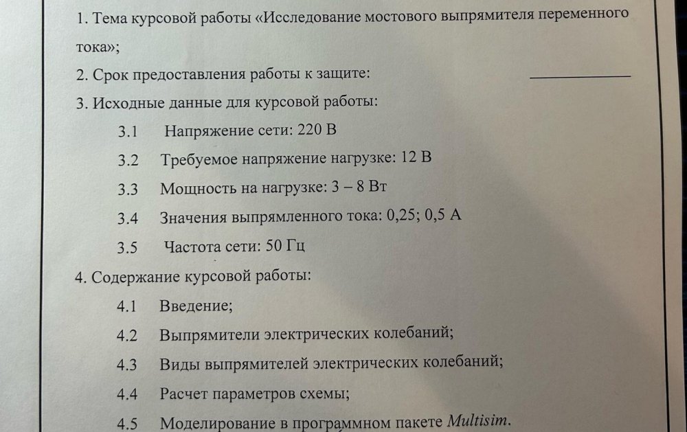 - ознакомление с теорией и последующий расчет параметров схемы двухполупериодного выпрямителя переменного тока;