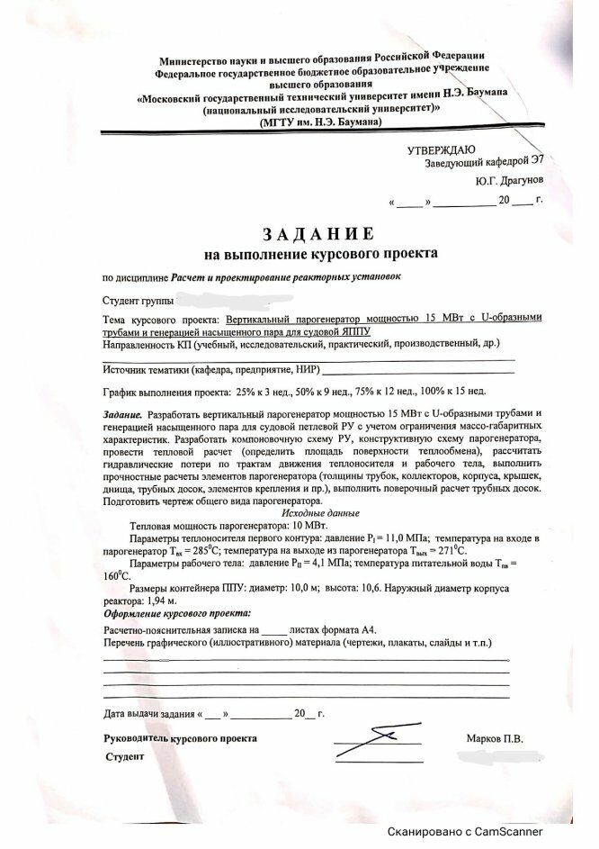 Для студентов МГТУ им. Н.Э.Баумана по предмету Расчет и проектирование реакторных установокВертикальный парогенератор насыщенного пара мощностью 10 МВт.Вертикальный парогенератор насыщенного пара мощностью 10 МВт.
