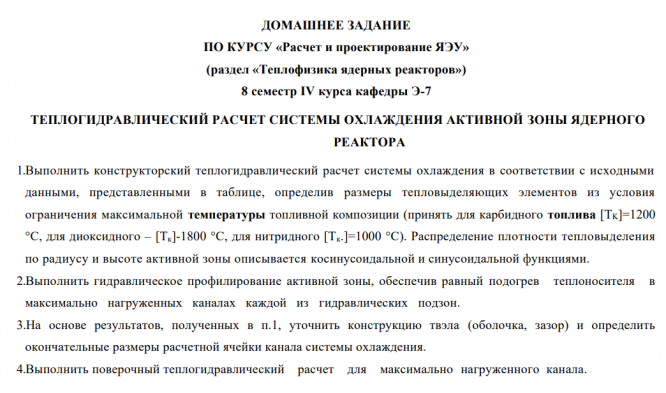Для студентов МГТУ им. Н.Э.Баумана по предмету Расчет и проектирование реакторных установокТеплогидравлический расчёт системы охлаждения активной зоны ядерного реактораТеплогидравлический расчёт системы охлаждения активной зоны ядерного реактора