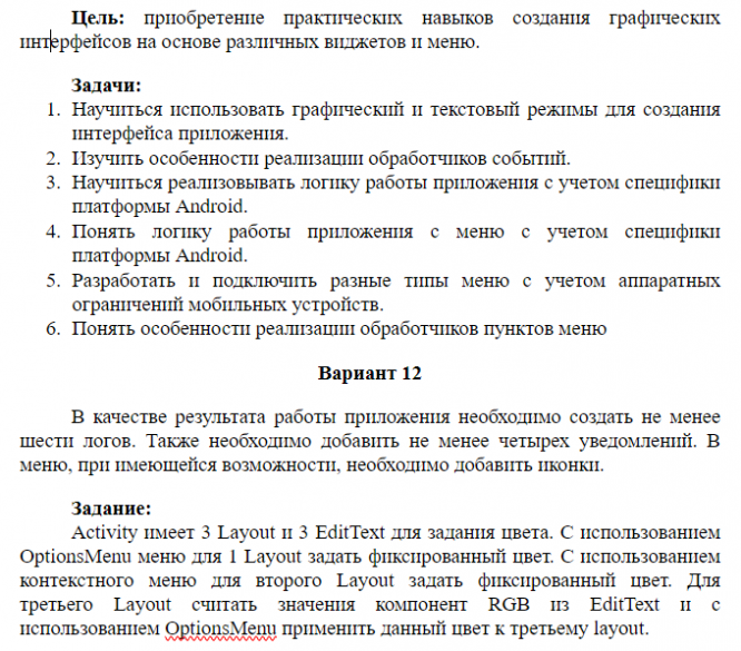 Лабораторная работа: Использование меню и виджетов графического интерфейса для разработки простых Android приложений вариант 12