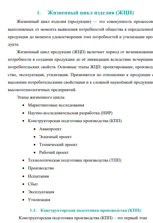 Жизненный цикл изделия (продукции) — это совокупность процессов, выполняемых от момента выявления потребностей общества в определенной продукции до момента удовлетворения этих потребностей и утилизации продукта. Жизненный цикл продукции (ЖЦП) включает период от возникновения потребности в создании продукции до её ликвидации вследствие исчерпания потребительских свойств. Основные этапы ЖЦП: проектирование, производство, эксплуатация, утилизация. Применяется по отношению к продукции с высокими потребительскими свойствами и к сложной наукоёмкой продукции высокотехнологичных предприятий