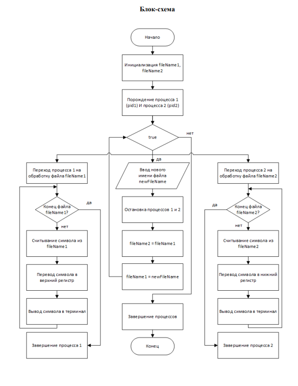 Программа принимает в качестве аргументов два файла. Под каждый файл создается строка, хранящая его название fileName1 и fileName2. С помощью системного вызова fork() порождаются два процесса. С помощью системного вызова execl() образ первого процесса заменяется на образ программы child1(написана заранее), которая осуществляет побайтное считывание файла fileName1 с помощью системного вызова read() и побайтный вывод с задержкой на каждой строке символа из fileName1 в верхнем регистре с помощью системного вызова write(). Аналогично, образ второго процесса заменяется на child2, осуществляющую вывод в нижнем регистре. Реализованный механизм обработки новых файлов работает следующим образом. Изначально строки, хранящие имена файлов, обрабатываемых первым и вторым процессамипотомками (fileName1 и fileName2) хранят второй и третий аргумент основной программы. Затем порождаются 2 процесса потомка с помощью fork() и запускается цикл, в котором вначале происходит два вызова execl() - замена образа первого и второго процесса на образ программ, переводящих содержимое файла в верхний и нижний регистры, при этом в качестве аргумента, отвечающего за имя обрабатываемого файла, первому execl'у передается fileName1, второму - fileName2. Далее управляющий процесс предлагает пользователю ввести новое имя файла, которое впоследствии будет передаваться первому процессу-потомку, поэтому оно присваивается в fileName1, при этом предыдущее значение fileName1 предварительно запоминается в fileName2 (т.к. по заданию необходимо, чтобы второй процесс-потомок переходил к обработке файла, ранее обрабатываемого первым процессом). После того, как пользователь закончит ввод и нажмет enter, оба порожденных процесса останавливаются с помощью сигнала остановки. На этом текущая итерация заканчивается. Сигналы остановки нужны для обеспечения немедленного перехода процессов-потомков к обработке новых файлов (что требуется по заданию). В начале следующей итерации процессы-потомки возобновляются, снова вызываются execl'ы, снова первому execl'у передается fileName1, второму - fileName2, после чего управляющий процесс снова запрашивает ввод нового имени файла, и так далее.