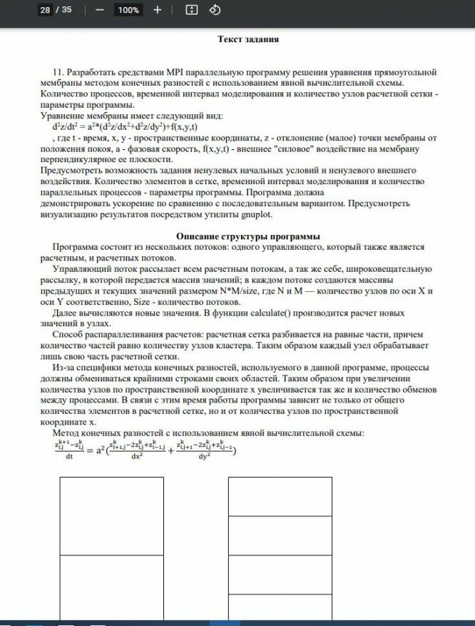11. Разработать средствами MPI параллельную программу решения уравнения прямоугольной мембраны методом конечных разностей с использованием явной вычислительной схемы. Количество процессов, временной интервал моделирования и количество узлов расчетной сетки - параметры программы. Уравнение мембраны имеет следующий вид: d 2 z/dt2 = a2*(d2 z/dx2+d2 z/dy2 )+f(x,y,t) , где t - время, x, y - пространственные координаты, z - отклонение (малое) точки мембраны от положения покоя, a - фазовая скорость, f(x,y,t) - внешнее "силовое" воздействие на мембрану перпендикулярное ее плоскости. Предусмотреть возможность задания ненулевых начальных условий и ненулевого внешнего воздействия. Количество элементов в сетке, временной интервал моделирования и количество параллельных процессов - параметры программы. Программа должна демонстрировать ускорение по сравнению с последовательным вариантом. Предусмотреть визуализацию результатов посредством утилиты gnuplot.