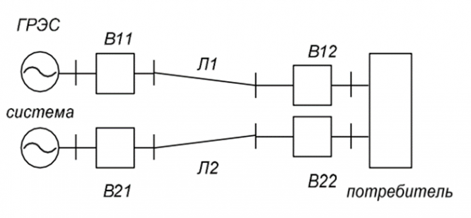 Промышленное предприятие (потребитель) получает электроэнергию от двух источников питания (ИП) – ГРЭС и районной подстанции системы (см. рис. 6.2). Каждая цепь может пропустить всю необходимую мощность. Параметры потока отказов и преднамеренных отклю