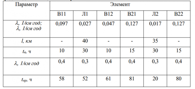 Таблица – Исходные данные для расчета надежности вариант 8, среднегодовая мощность потребителя Р = 37 МВт
