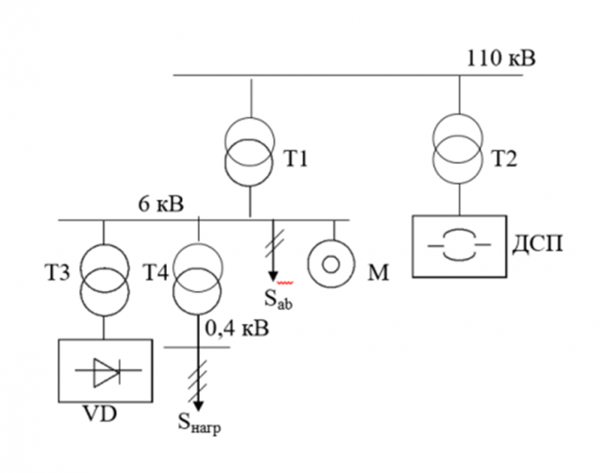 Для заданной схемы рассчитать коэффициенты n-ой гармонической составляющей напряжения, коэффициент несинусоидальности на шинах 110 и 6 кВ, дополнительные потери мощности и снижение срока службы цехового трансформатора Т4 и асинхронного двигателя М из-за перегрева токами высших гармоник и несимметрии напряжения. Нормальный срок службы принять 20 лет. Рабочая температура 75ºС.