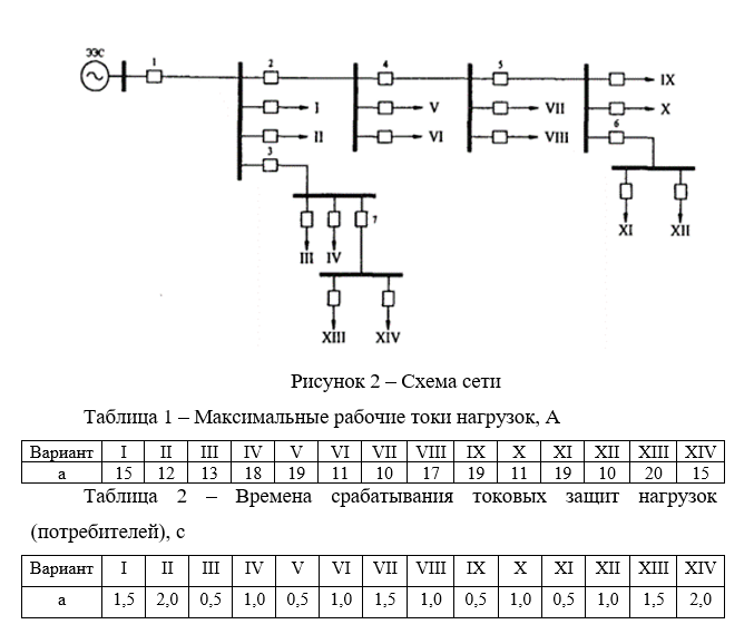 Максимальные рабочие токи нагрузок I-XIV приведены в таблице 1, а выдержки времени максимальных токовых защит потребителей I-XIV – в таблице 2.