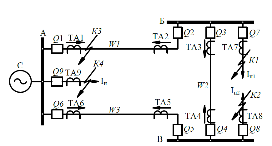проверить чувствительность защиты, установленной на питающем конце одной из линий, отходящих от шин подстанции А.