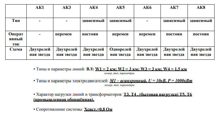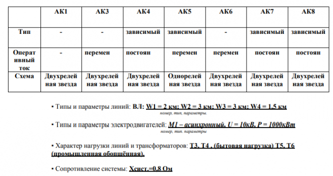 ▪ Произвести расчёт основных параметров следующих защит: АК1; АК3(; АК6; номера и типы защит