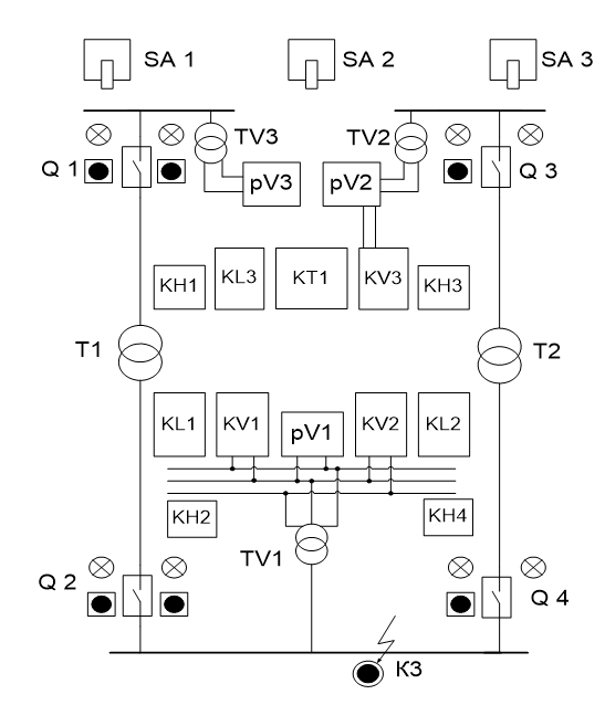 - Отключение выключателя Q2 и включение резервного трансформатора Т2 при отключении выключателя Q1 трансформатора Т1.