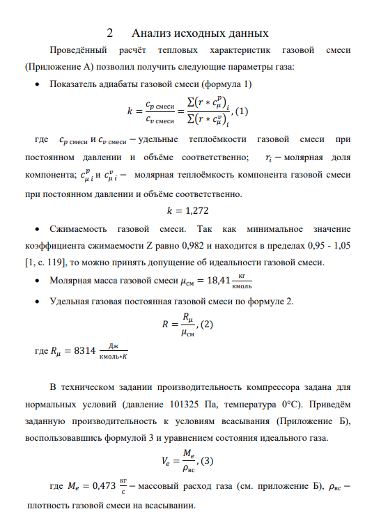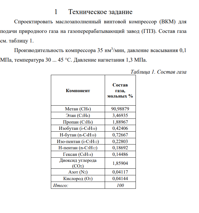 1 Техническое задание Спроектировать маслозаполненный винтовой компрессор (ВКМ) для подачи природного газа на газоперерабатывающий завод (ГПЗ). Состав газа см. таблицу 1. Производительность компрессора 35 нм3 /мин, давление всасывания 0,1 МПа, температура 30 ... 45 °C. Давление нагнетания 1,3 МПа.