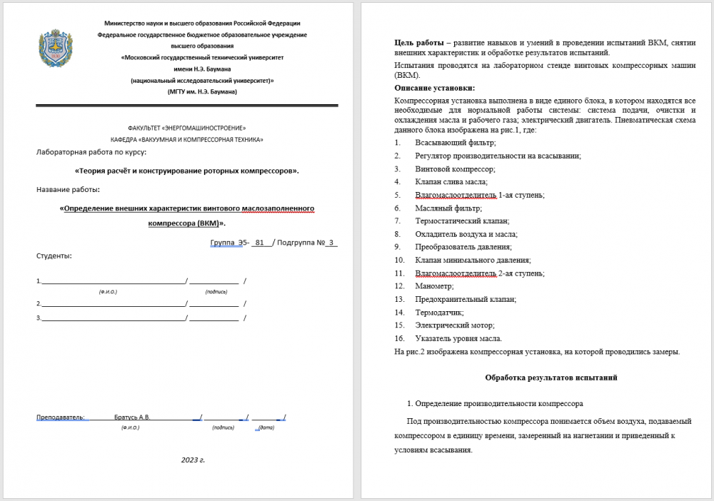 Для студентов МГТУ им. Н.Э.Баумана по предмету Ротационные компрессорыОпределение внешних характеристик винтового маслозаполненного компрессора (ВКМ)Определение внешних характеристик винтового маслозаполненного компрессора (ВКМ)