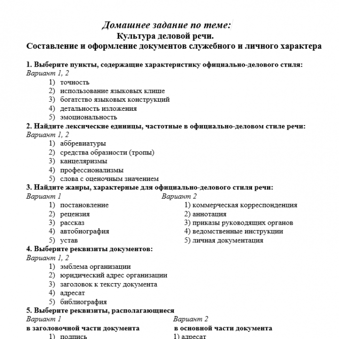 Вопросы/задания к заданиям: Культура деловой речи. Составление и оформление документов служебного и личного характера