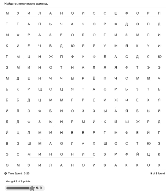 Русский язык СОО Практическое занятие 1. Задание 10 Найдите лексические единицы филворд.