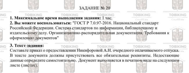 Задание № 20 1. Максимальное время выполнения задания: 1 час. 2. Вы можете воспользоваться: "ГОСТ Р 7.0.97-2016. Национальный стандарт Российской Федерации. Система стандартов по информации, библиотечному и издательскому делу. Организационно-распорядительная документация. Требования к оформлению документов" 3.Текст задания: Составьте приказ о предоставлении Никифоровой А.Н. очередного оплачиваемого отпуска. В тексте документа должны присутствовать все обязательные реквизиты. Недостающие данные определите самостоятельно. Документ выполняется в печатном виде на следующем листе (листах)..