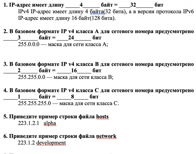 3. В базовом формате IP v4 класса В для сетевого номера предусмотрено _____2______ байт = _____16_____ бит