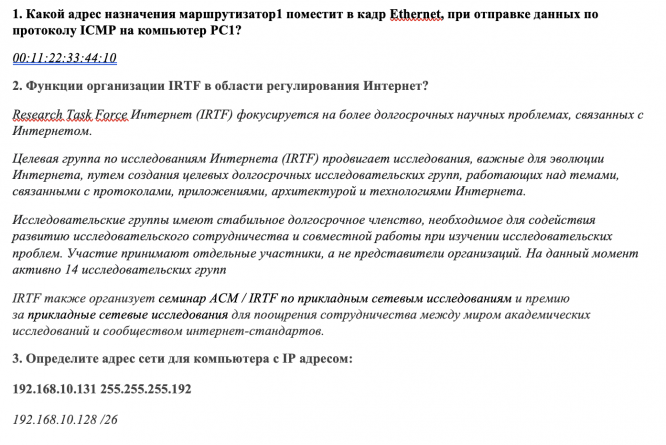 1. Какой адрес назначения маршрутизатор1 поместит в кадр Ethernet, при отправке данных по протоколу ICMP на компьютер PC1?