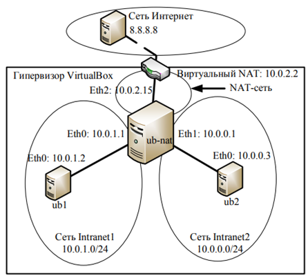 Целью работы является изучение механизмов преобразования сетевых адресов: NAT, Masquerade. Подробно рассмотрены некоторые сетевые возможности VirtualBox, который будет использован для создания необходимой инфраструктуры. Необходимо решить следующие задачи: