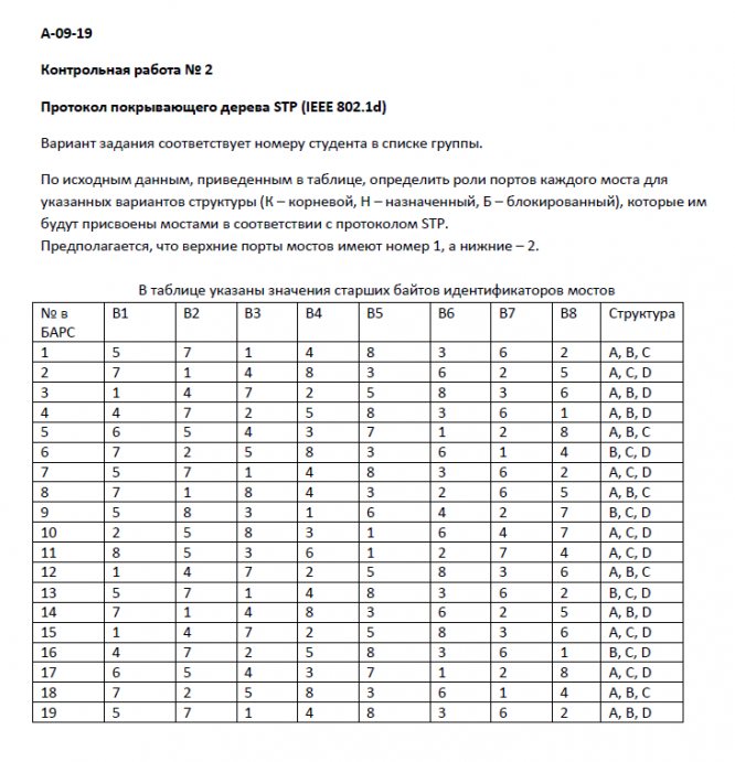 Вопросы/задания к контрольной работе 2: Протокол покрывающего дерева STP (IEEE 802.1d)