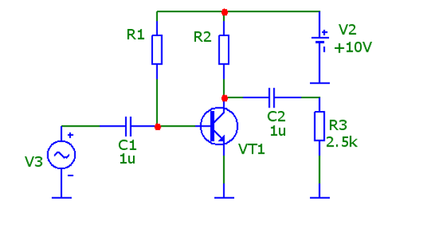 Прочитайте задание и запишите значение сопротивления в кОм и коэффициент усиленияДля схемы усилителя на биполярном транзисторе, приведенной на рисунке, рассчитайте значение сопротивления R2 для обеспечения рабочей точки VT1 по постоянному току: Iко = 2 мА, Uкэо= 5 В. Определите коэффициент усиления схемы по напряжению в области средних частот. Параметры транзистора VT1: коэффициент усиления тока базы равен 100, крутизна 80мА/В.