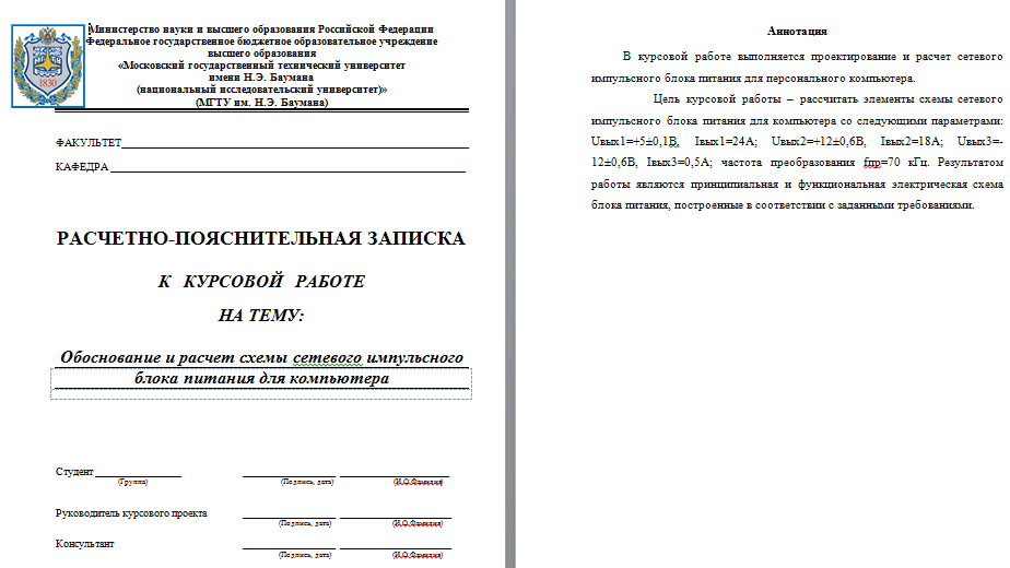 Для студентов МГТУ им. Н.Э.Баумана по предмету Схемотехника и ЭлектротехникаОбоснование и расчет схемы сетевого импульсного блока питания для компьютераОбоснование и расчет схемы сетевого импульсного блока питания для компьютера