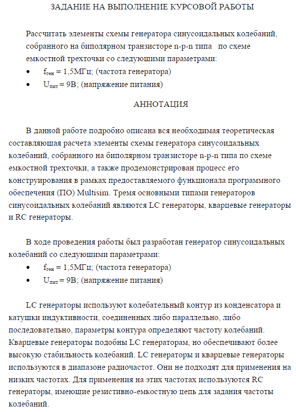 Расчет генератора синусоидальных колебаний собранного на биполярном транзисторе n-p-n типа.pdf