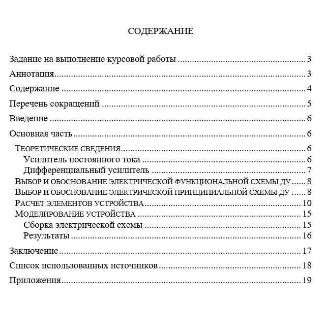 В данной курсовой работе представлена вся необходимая теоретическая составляющая, на основе которой был разработан дифференциальный усилитель (ДУ). Подробно продемонстрирован и описан процесс расчета устройства с данными и требуемыми техническими параметрами, подбора его составляющих элементов, а так же моделирования схемы ДУ, на основе произведенный расчетов, в рамках предоставляемой функциональной мощности программного обеспечения (ПО) Multisim. Таким образом, в ходе выполнения данной курсовой работы был разработан ДУ, у которого Ек=15В (напряжение источника питания), ΔUвх=1мВ (максимальные изменения входного сигнала), Uвх=0мВ (максимальные изменения входного сигнала в режиме покоя), Rн=1,1кОм (сопротивление нагрузки), Δ Uвых=0,9В (максимальное изменение выходного напряжения). Полученное устройство может применяться в случаях, когда информацию несёт разность напряжений между двумя точками, а не абсолютное значение напряжения в некоторой точке (относительно уровня заземления) и главным образом необходим для усиления постоянного сигнала на фоне большого уровня помех, путем выделения небольшой разности напряжений.