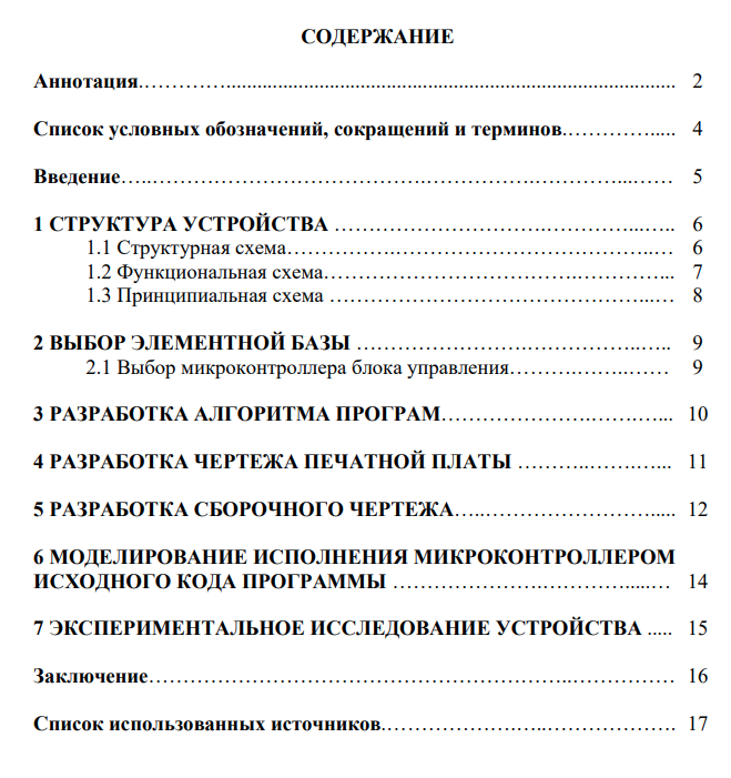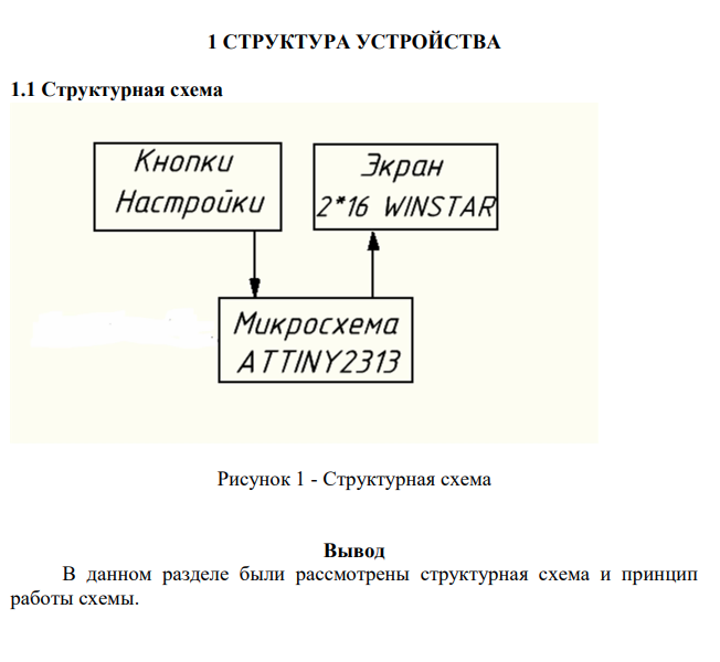 В рамках данной работы была разработана электрическая структурная и принципиальная схема устройства на микроконтроллере ATTINY2313. Обоснован выбор элементной базы. Описаны принципы работы устройства. Спроектирована топология печатной платы устройства. Разработан алгоритм работы блока управления. Проведено моделирования выполнения алгоритма разработанной программы в САПР ISISProteus. Изготовлена печатная плата разработанной топологии и макет устройства на базе печатной платы. Осуществлено программирование микроконтроллера при помощи программатора. Проведено экспериментальное исследование макета устройства: проверка правильности разработанных алгоритмов и сравнение параметров работы устройства с параметрами, полученными при моделировании. Ключевые слова: микроконтроллер, устройство, кнопка, схема, алгоритм, печатная плата, программа, чертеж, моделирование, исследование.