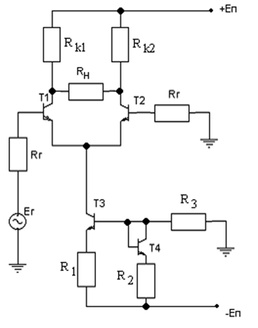 На транзисторах Т1 и Т2 собран дифференциальный каскад.