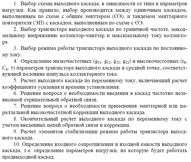 Расчет импульсного усилителя предполагает множество решений. В данной работе нам необходимо найти наиболее оптимальный вариант решения. Сам расчет начинается с выходного каскада, зная амплитуду выходного сигнала, величину и характер внешней нагрузки выбирают соответствующий транзистор. Производиться полный расчет выходного каскада и по найденным значениям коэффициента передачи и времени установления принимается решение для введения коррекции каскада, если эти значения не соответствуют ожидаемым.