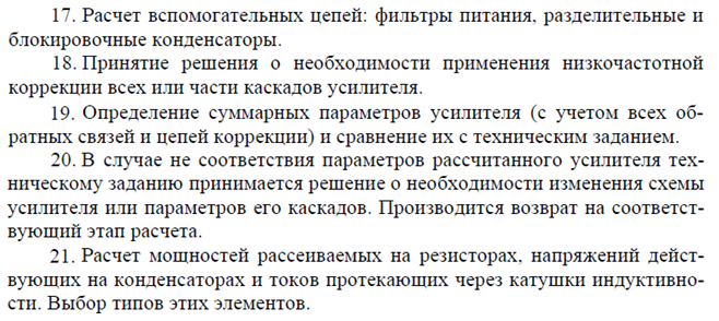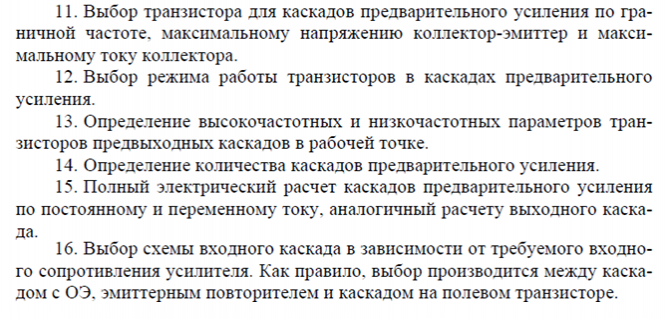 Затем выбирается транзистор для каскадов предварительного усиления. Определяется их количество исходя из заданной полярности входа и выхода всего усилителя, коэффициента усиления входного и времени установления входного и предварительного каскадов. После определения количества этих каскадов выполняется их расчет. По результатам расчета принимается решение о коррекции каскадов, в последнюю очередь выполняется расчет входной цепи.