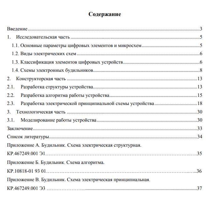 В рамках данной работы вышеуказанные достоинства цифровой схемотехники будут использованы при разработке электронного будильника, с применением методов синтеза цифровых электронных схем, с целью изучения принципов разработки и моделирования схем цифровых электронных устройств. Расчетно-пояснительная записка состоит из введения, исследовательской, конструкторской и технологической частей, заключения и списка литературы. Оформлена на 34 листах в формате А4. Графическая часть включает структурную схему на 1 листе в формате А4, электрическую-принципиальную на 1 листе в формате А1, схему алгоритма на 1 листе формата А2.