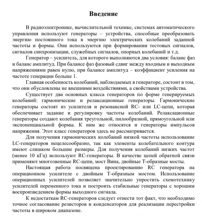 В данной курсовой работе представлены описание схем, расчетные методики RC генератора на операционном усилителе с двойным T-образным мостом. В соответствии с заданием рассчитаны необходимые параметры схемы. Было проведено моделирование схемы в среде Multisim, для этой схемы амплитуда входного сигнала равна 76,405 мВ, амплитуда выходного сигнала равна 8,566 В, частота генерации равна 2,476 кГц ≈ 2,5кГц. RC генераторы применяются в основном в диапазоне низких частот. Для получения гармонических колебаний с малыми искажениями используют цепь отрицательной обратной связи и операционный усилитель. Двойной Т-образный мост является заграждающим фильтром и в схеме генератора включается в цепь отрицательной обратной связи. Колебания возникают только на квазирезонансной частоте, поскольку на всех частотах, кроме квазирезонансной, преобладает отрицательная обратная связь. RC-генераторы нашли применение в радиоэлектронике, вычислительной технике и системах автоматического управления.