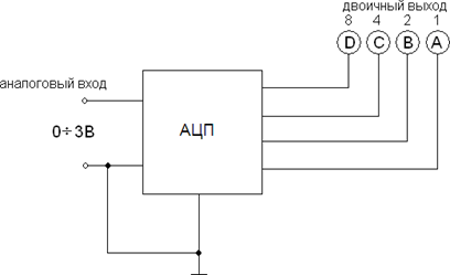 Если в таблице истинности для АЦП ( см. рис.) аналоговое входное напряжение равно 1В, то на выходе мы должны получить двоичное число