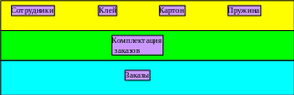 Схема данных представлена на рисунке 4.1. Таблица “Сотрудники мастерской” связана с таблицей “Заказы” посредством поля “Код сотрудника”, которое присутствует в обеих таблицах. В свою очередь, таблица “Заказы” связана с таблицей “Комплектация заказов” посредством поля “Код изделия”. Далее также связана таблица “Комплектация заказов” с таблицами: “Клей”, “Картон”, “Пружина” посредством поля “Код”.