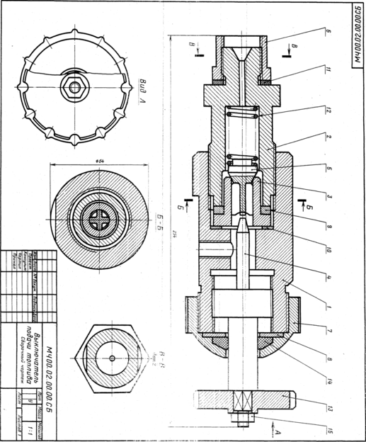 Для включении подачи топлива вращают маховичок нов. 13. Игла поз. 4, действуя на клапан поз. 5, сжимает пружину поз. 12, при этом топливо проходит через отверстия деталей поз.6,3,2 и через нижнее резьбовое отверстие корпуса поз. 1 выходит наружу и собирается в мерный стакан (на чертеже не показан). Расход топлива,подаваемого поочередно в цилиндры дизеля, измеряют с помощью специальных устройств (на чертеже не показаны).