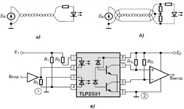 (а) - экранирование канала передачи сигнала, (б) - дифференциальное усиление входного сигнала, (в) - применение витых проводников