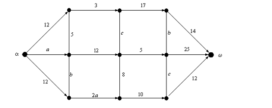 По вертикальным ребрам (без стрелок) возможно движение в любом направлении. Значения параметров a, b, c взять из таблицы.