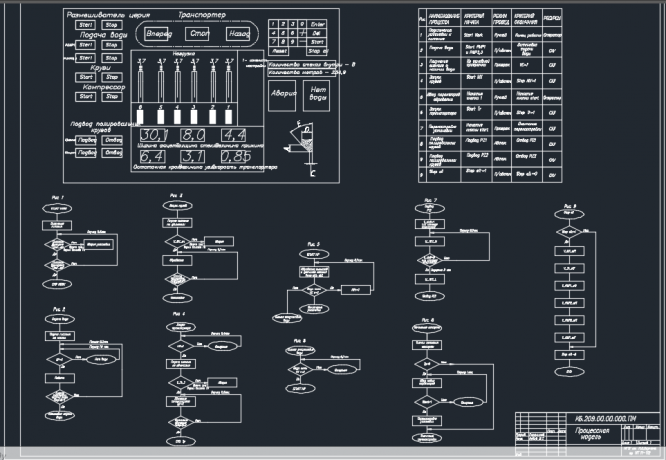 Курсовой проект выполнен на четырех листах формата А3 и расчетно-пояснительной записки. На первом листе приведены алгоритмы автоматизированных процессов. На втором третьем и четвертом листах – комплексно- принципиальная схема установки: механика, пневмосистема, гидравлическая система, энергообеспечение, системы автоматизированного обеспечения. В расчетно-пояснительной записке приведены необходимые пояснения и расчеты, отражены принципы построения САУ установки, даны описания листов проекта.