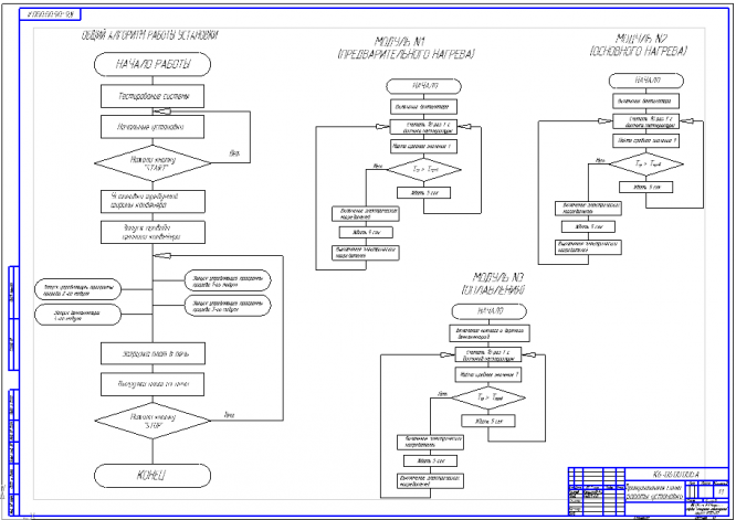Курсовой проект выполнен в объеме 4-х листов А2 и расчетно-пояснительной записки. На первом листе приведены общий алгоритм работы установки и отдельных его модулей. На втором и третьем листах - комплексная принципиальная схема установки - кинематика, энергообеспечение, системы автоматического и ручного управления. На четвертом листе – электрическая схема инвертирующего усилителя. В расчетно-пояснительной записке приведены необходимые пояснения и расчеты, отражены принципы построения СУ установки, даны описания листов проекта.