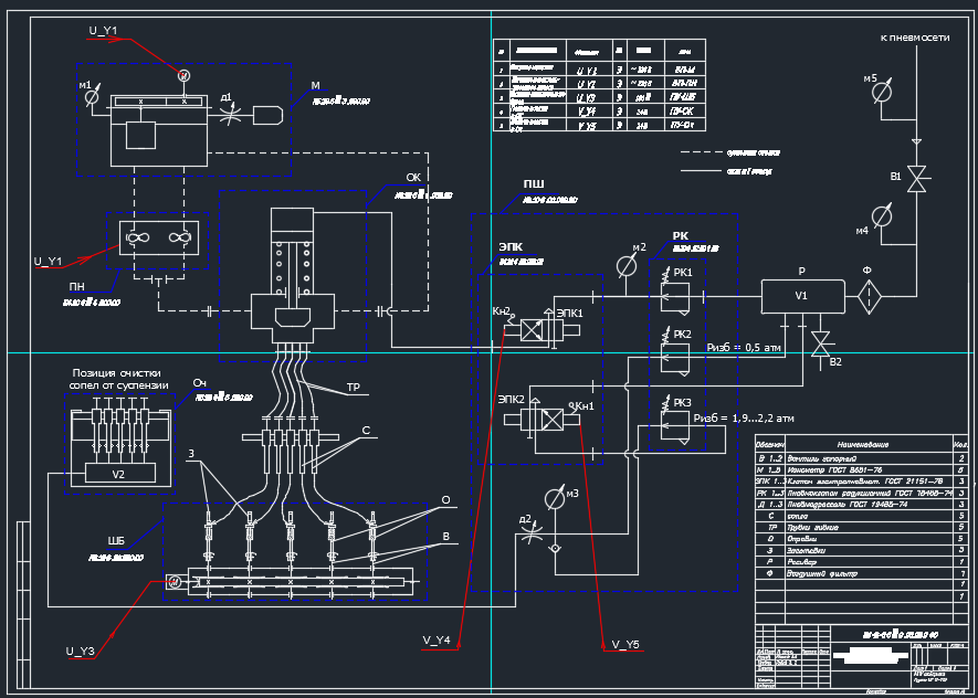 Затем оператор открывает вентиль, соединяющий установку с пневмосетью предприятия. Давление в пневмосети 0,7Мпа. Оператор должен следить по показаниям манометра за давлением в пневмосети и в случае несоответствия давления норме отключить установку.