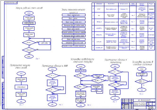 Курсовой проект выполнен на четырех листах формата А3 и расчетно-пояснительной записки. На первом листе приведены алгоритмы автоматизированных процессов. На втором и третьем листах – комплексно- принципиальная схема установки: механика, вакуумная система, газовая система, энергообеспечение, системы автоматизированного. На четвертом листе - принципиальная электрическая схема. В расчетно-пояснительной записке приведены необходимые пояснения и расчеты, отражены принципы построения СУ установки, даны описания листов проекта.